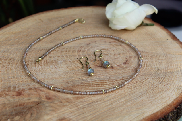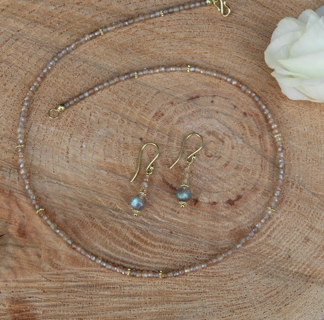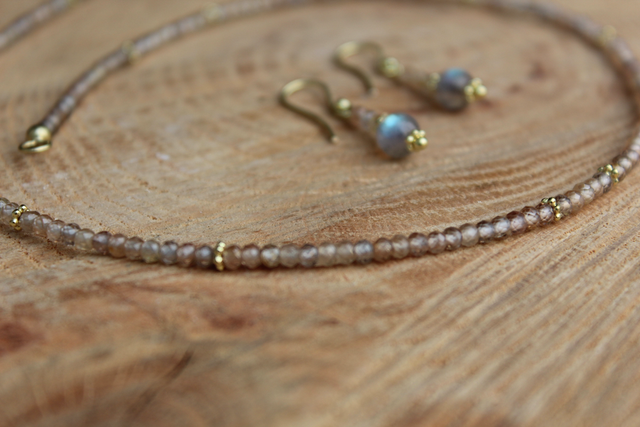Kette mit braunen Zirkon Perlen. Zwischenteile und Verschluss aus 925 Sterlingsilber plattiert mit 585 Gelbgold.