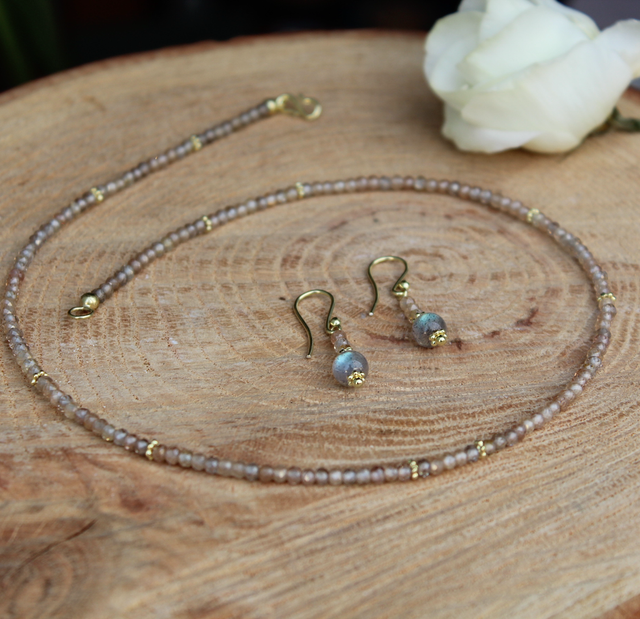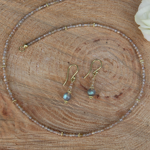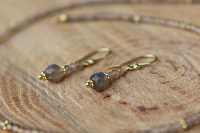 Ohrringe mit Labradorit und Zirkon in 925 Silber mit 585 Gelbgold plattiert. Passend zur Kette im Shop.
