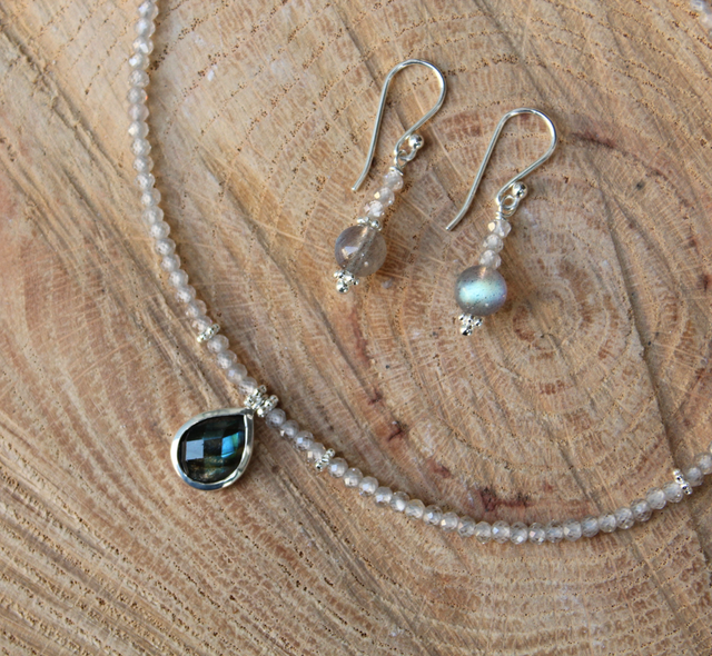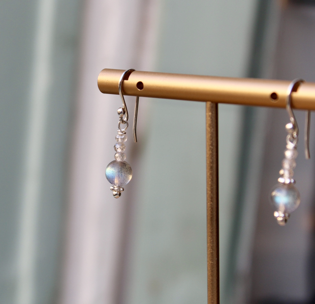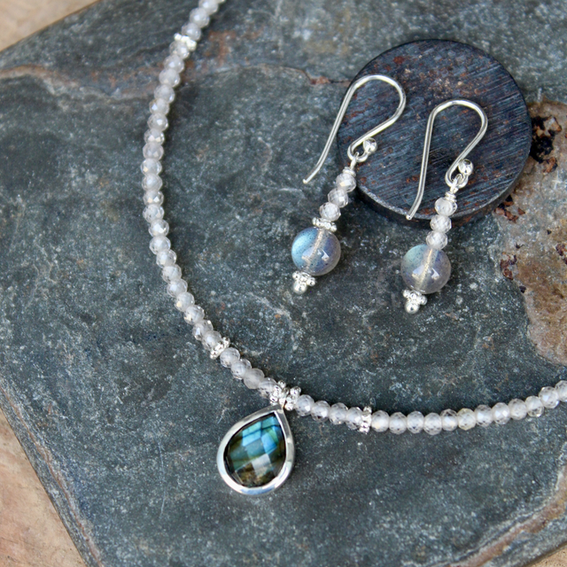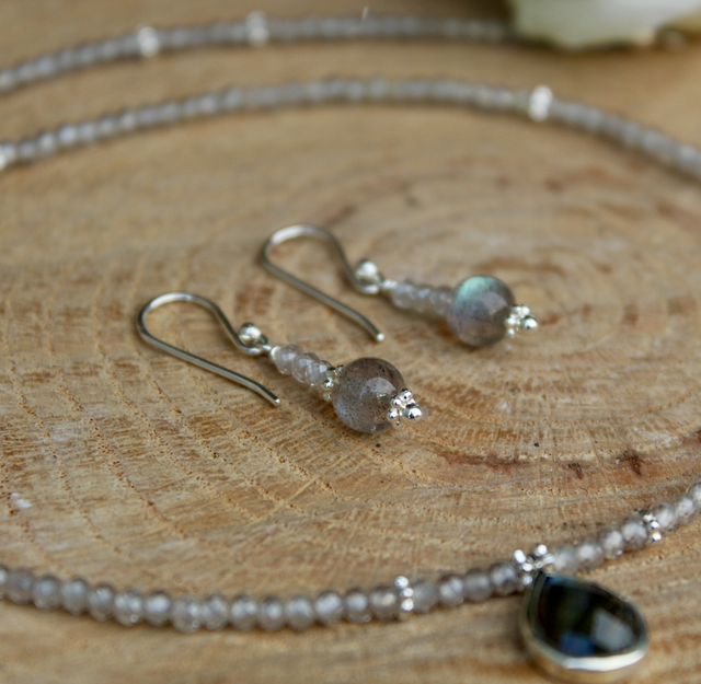 Ohrringe mit Labradorit und Zirkon in 925 Silber. Passend zur Kette im Shop.