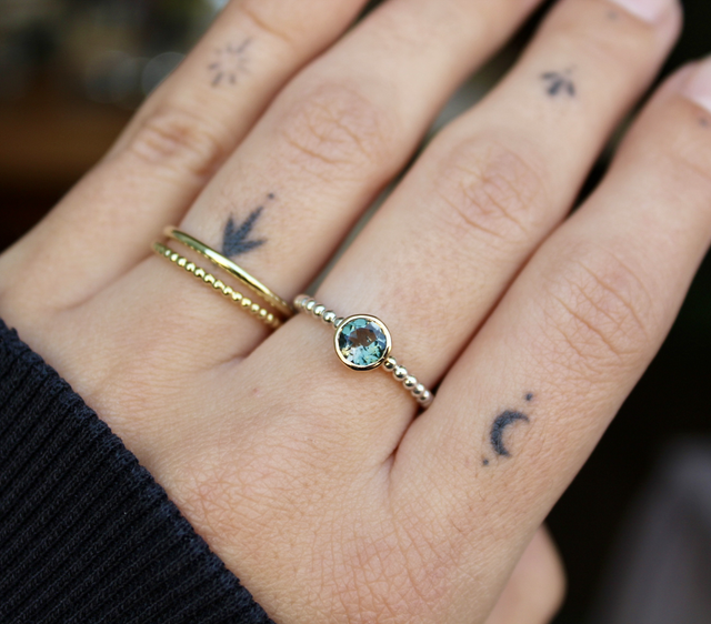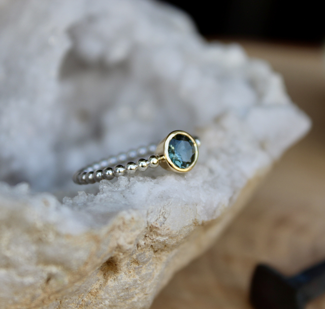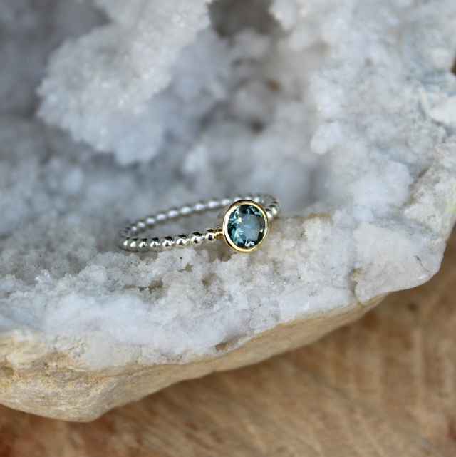 Handgefertigter Ring mit einem zweifarbigen (grün/gelb) Turmalin, gefasst in 750 Gelbgold auf silberner Ringschiene.