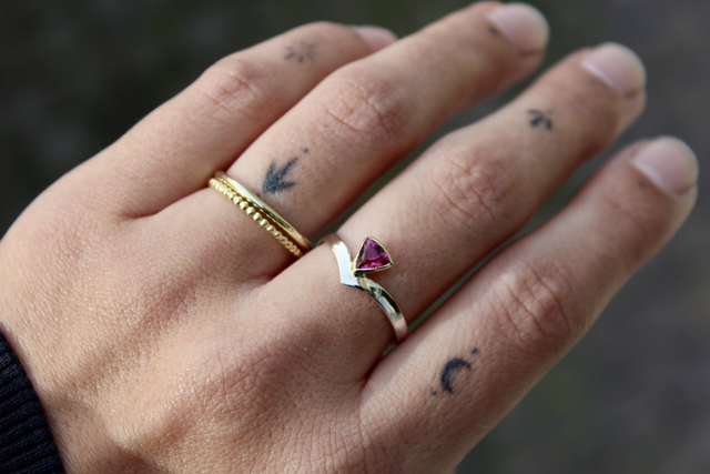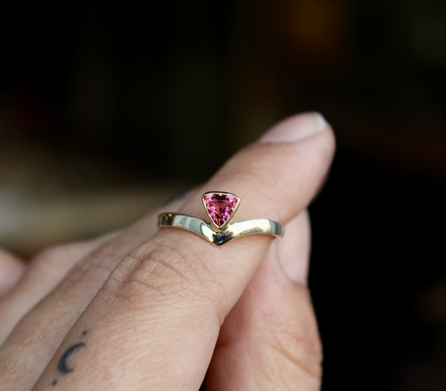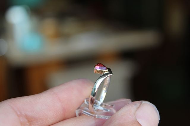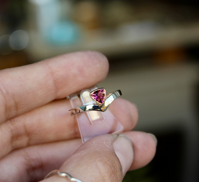 Handgefertigter Ring mit einem pinken Turmalin in 585 Gelbgold gefasst, auf einer Ringschiene aus 925 Silber.